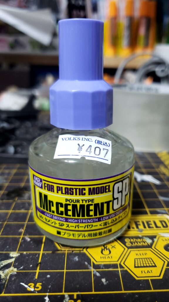 こんな感じで合わせ目が完全に見えなくなります。使ったのは、以下の写真の流し込みタイプの接着剤。プラを溶かして接着するのでかなり強力です。