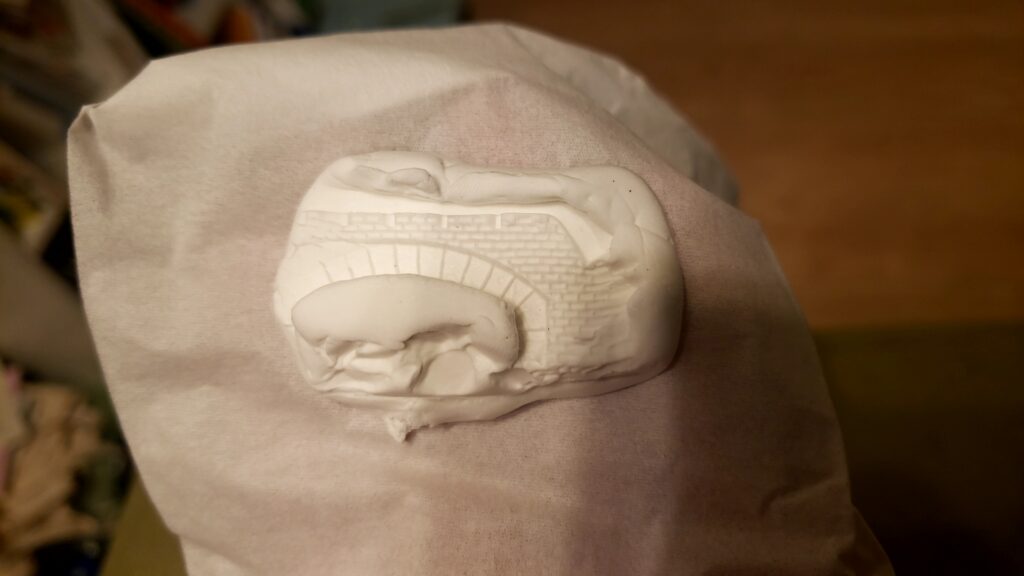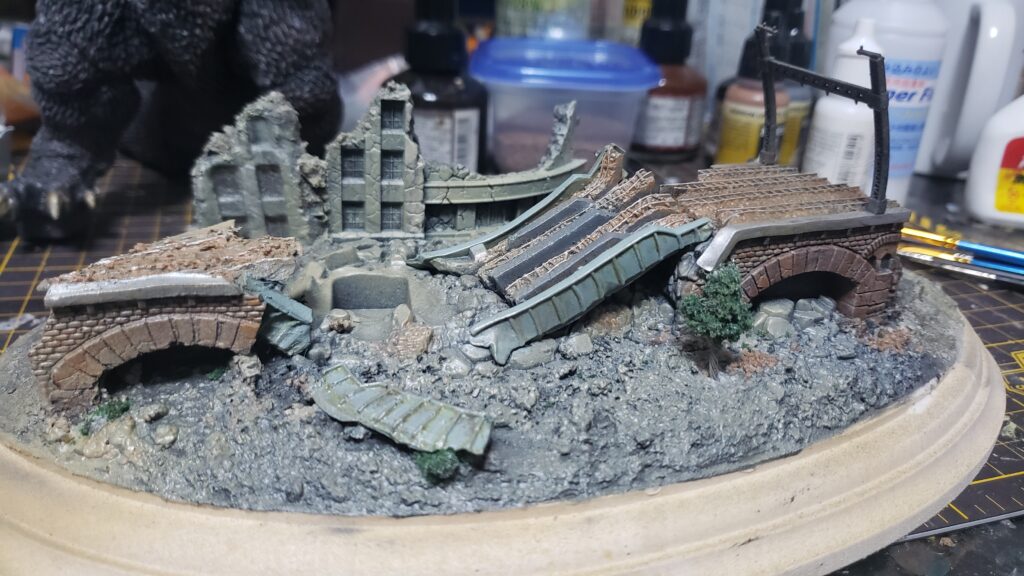軽めの紙粘土をベースにし、少し盛り上げ気味に土台を制作していきます。ちなみに、ゴジラを中心に少し横長のベースにしたので、高架部分を拡張。左側には複製した高架。