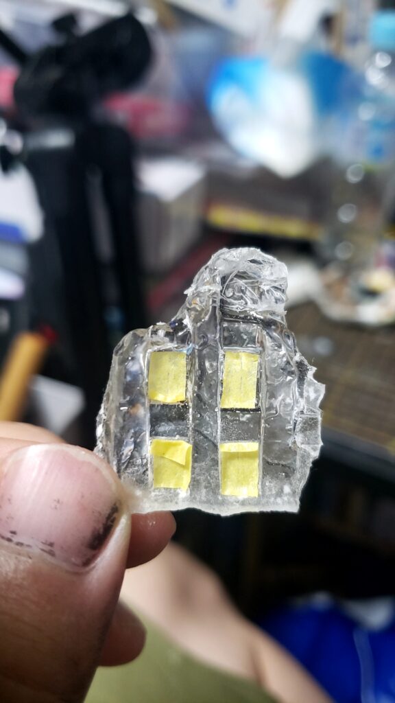 上記のように、粘土で型を取り、レジンを流し込みます。透明レジンしかなかったので、塗装前はすけすけです。