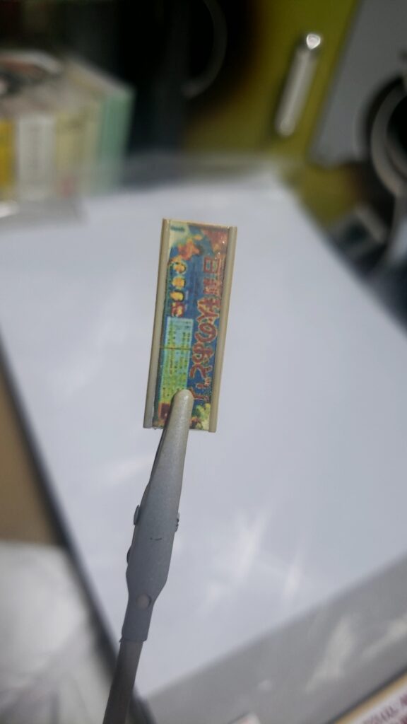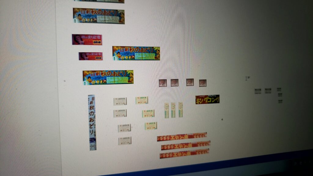 こんな感じで、当時の日劇の写真を参考に看板やポスターなどを作成し、プラ板に貼り付けていきます。スケール感を出すべく、なるべくこのサイズの情報量を増やしていきます。