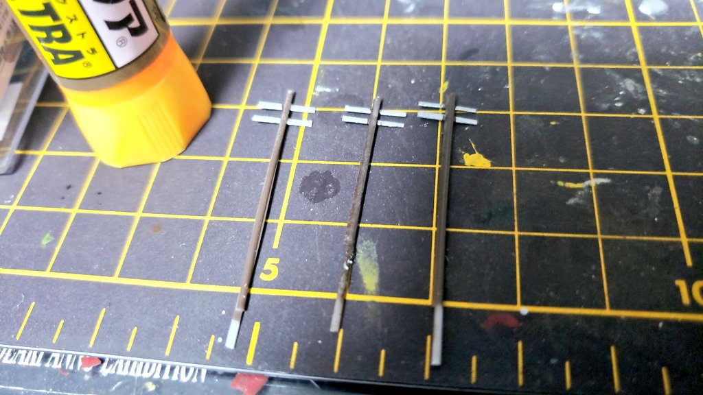 いつもならNゲージの電柱を使用するところ、今回は他社製のキットは使用できないので、1ミリのプラ棒とプラ板(クリアファイル)でフルスクラッチ。